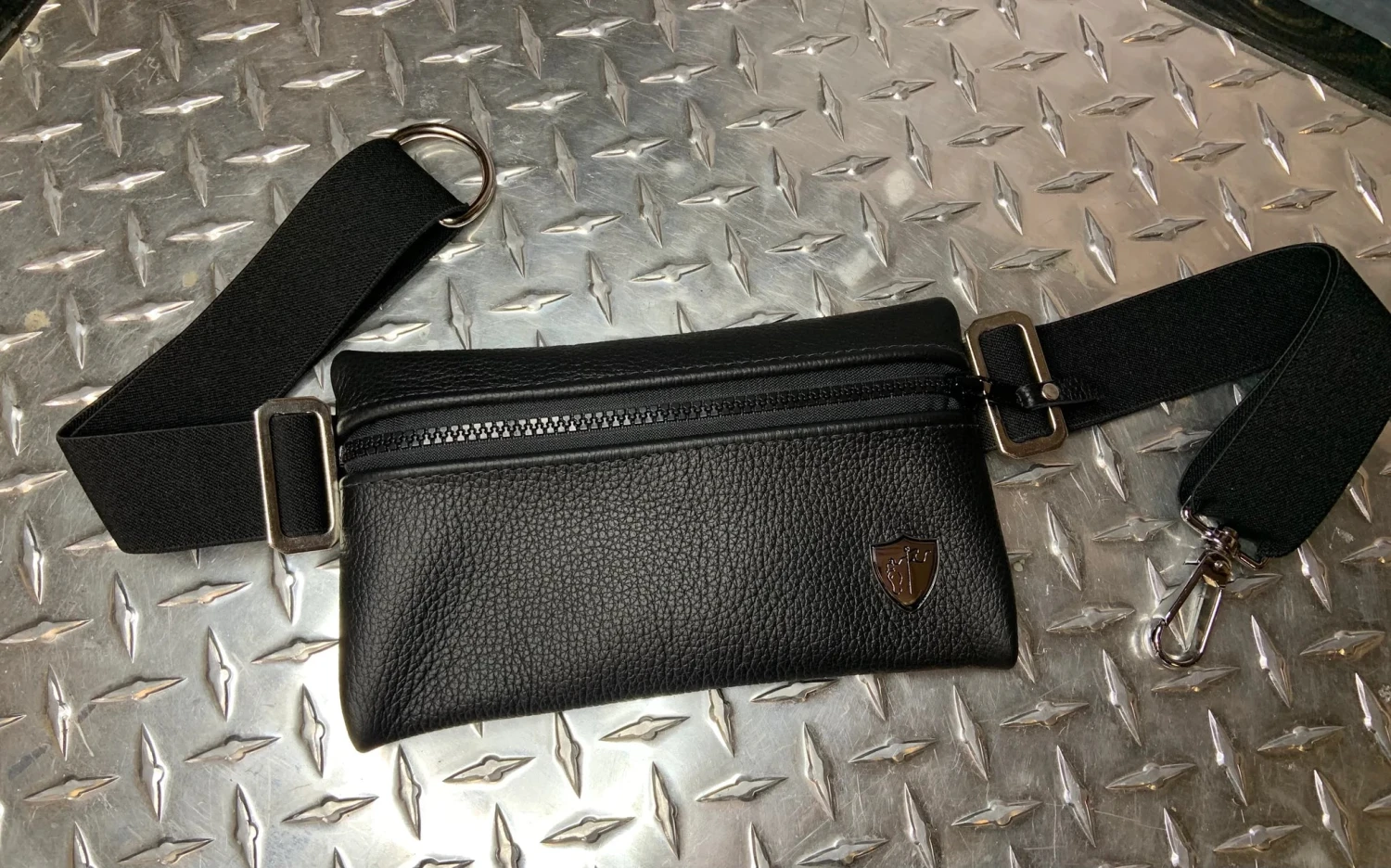Function at its finest! Features a leather pouch attached to an adjustable elastic belt. Can be worn with or without belt loops.