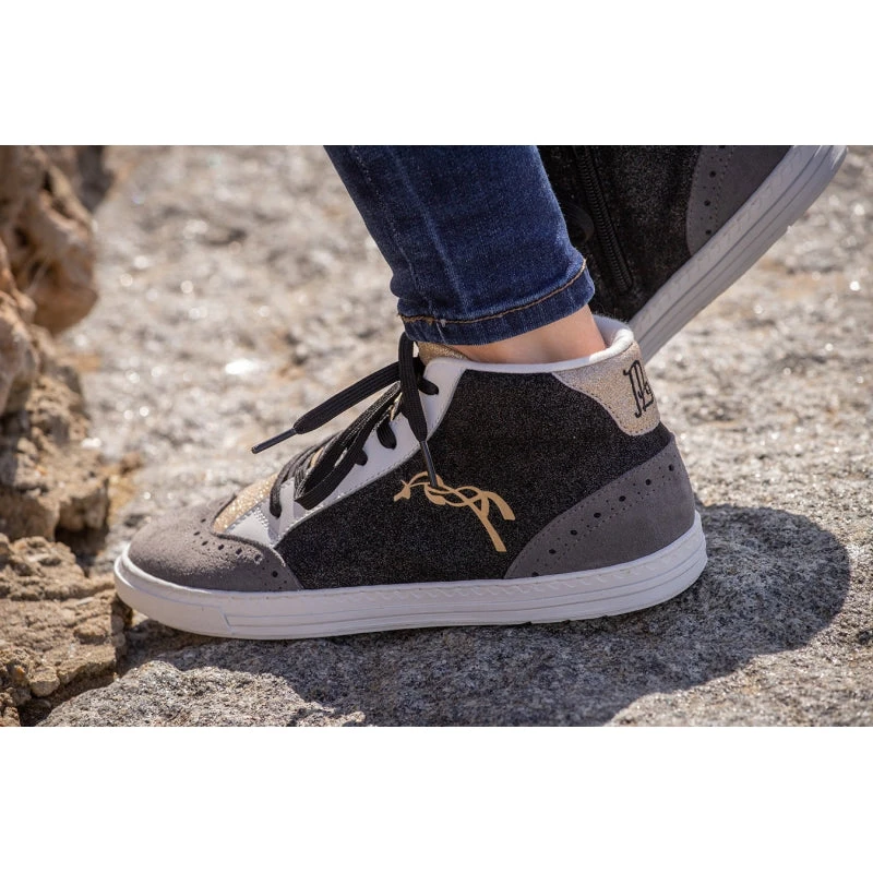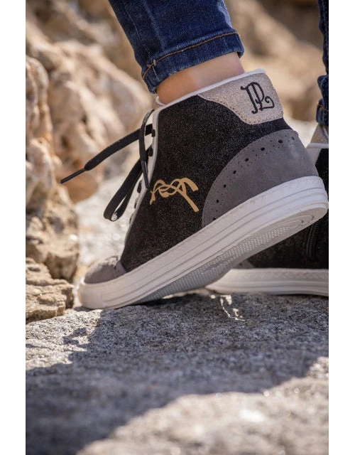 Jupiter sneakers are tricolour (black, golden & grey), they have a perfect fit, and are super comfy because they hold your ankle. They are super easy to fasten thanks to inner zippers, no need to lace it every time! The tip of the sneaker is not too short or not too round, and the Pénélope logo is embroidered on the side, for a very feminine look.