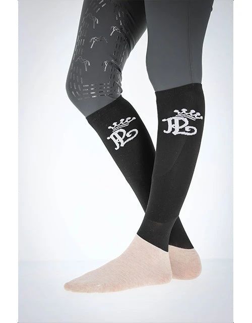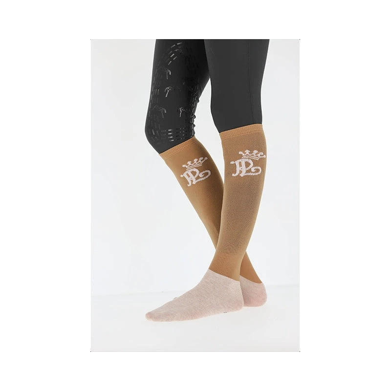 High socks that reach below the knee. They are made of very thin lycra fabric on the leg and slightly thicker on the foot. They are worn over riding breeches for comfort and elegance !